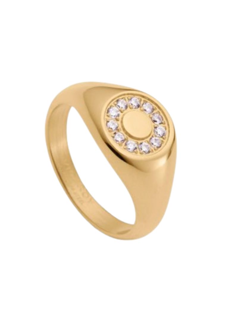 Anillo tipo sello fabricado en acero ip dorado con forma redonda y decorado con circonitas blancas al rededor del circulo.