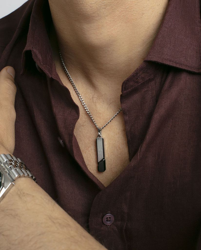 Aporta un toque de sofisticación moderna a tu estilo con este collar de hombre, que presenta una placa bitono en acero e IP negro. Su diseño versátil y elegante lo convierte en el complemento perfecto para realzar tanto looks casuales como formales. Con una longitud de 50 cm más una extensión de 5 cm, se ajusta cómodamente a tu cuello, ofreciendo un ajuste perfecto y personalizable.