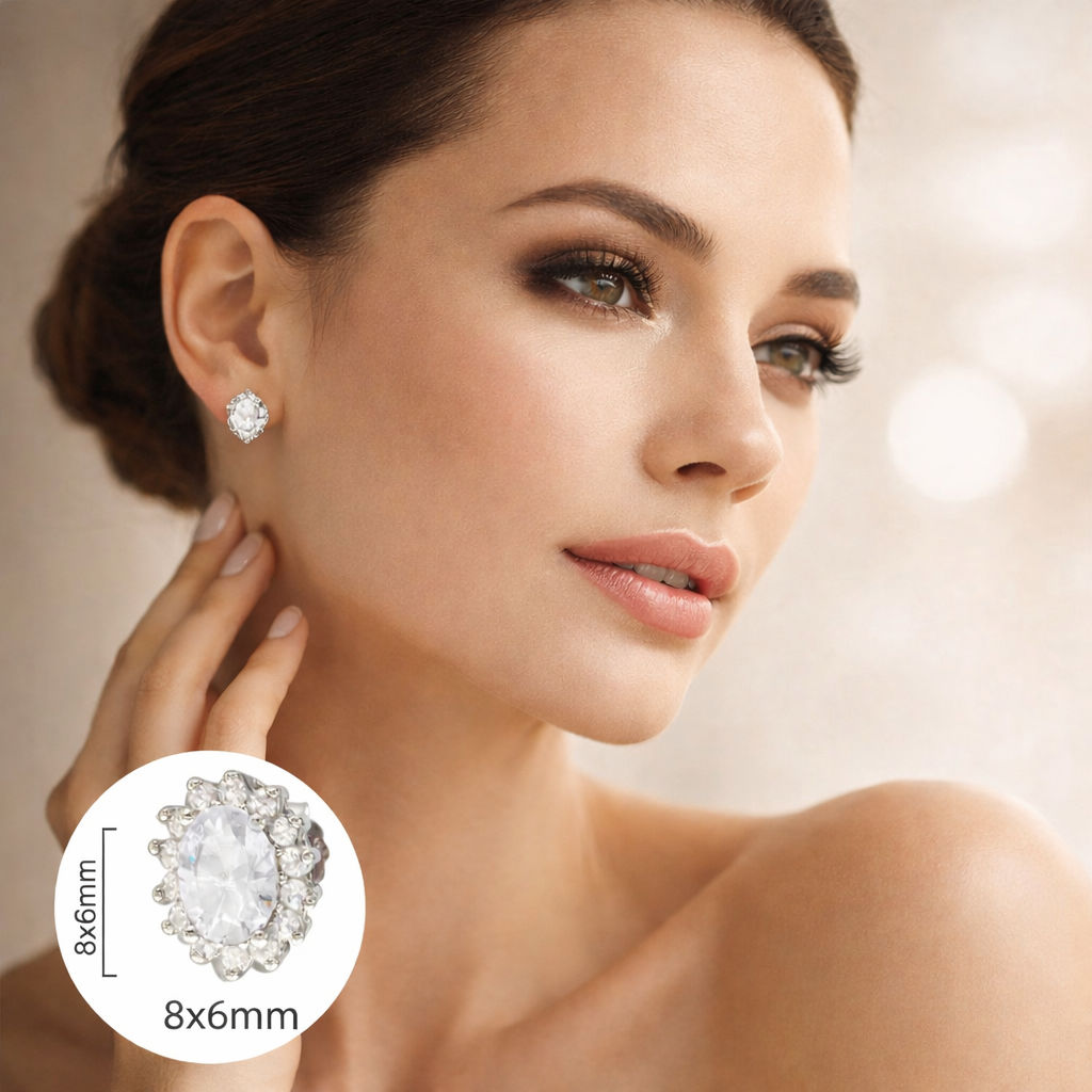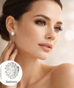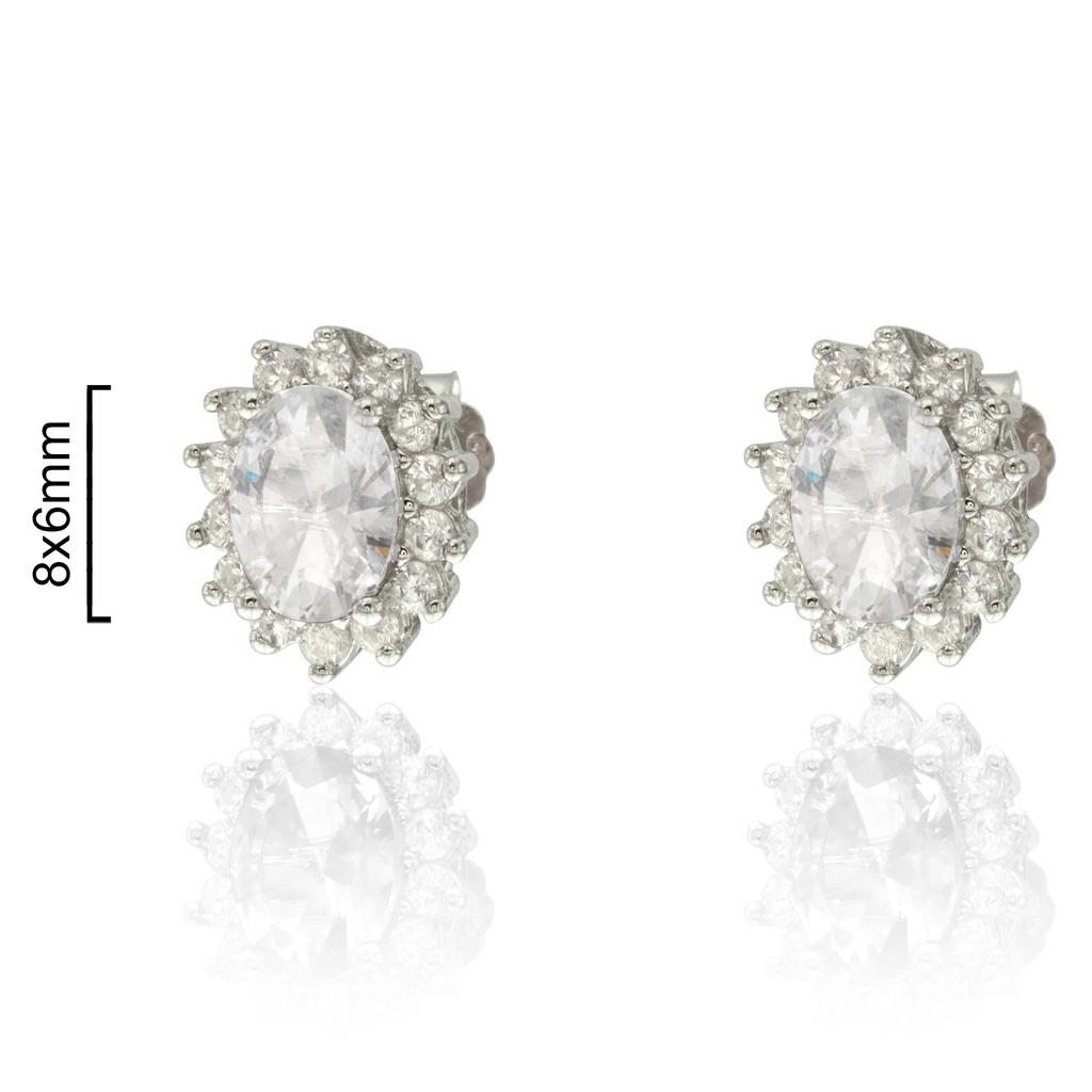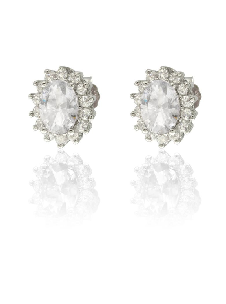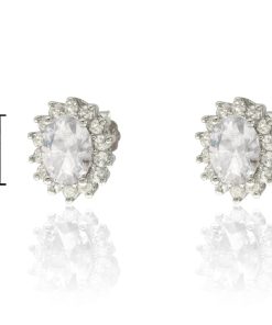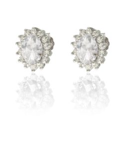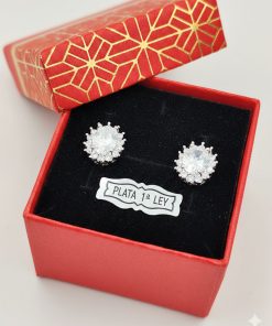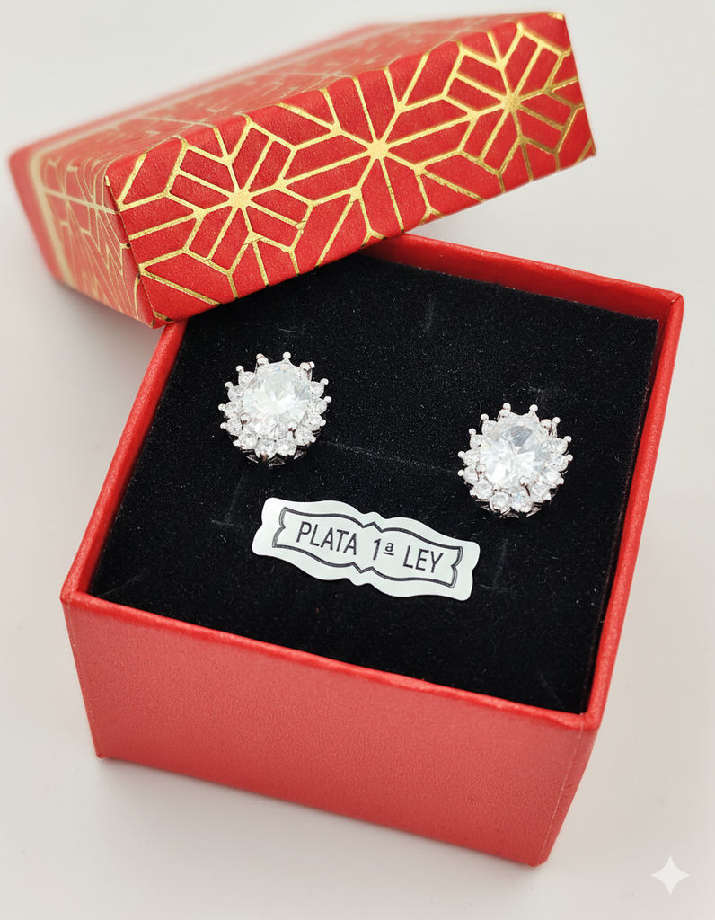 Pendientes estilo roseta fabricados en plata de ley 925 acabados en rodio con circonita central rodeada de circonitas blancas y cierre de presión.