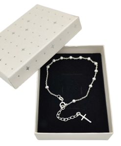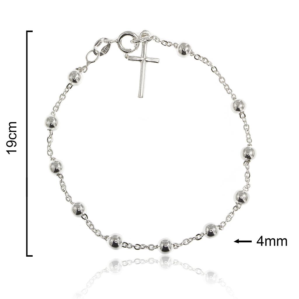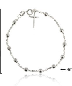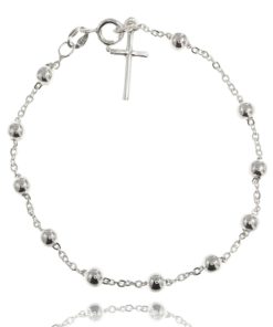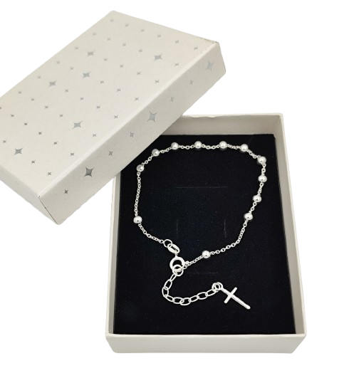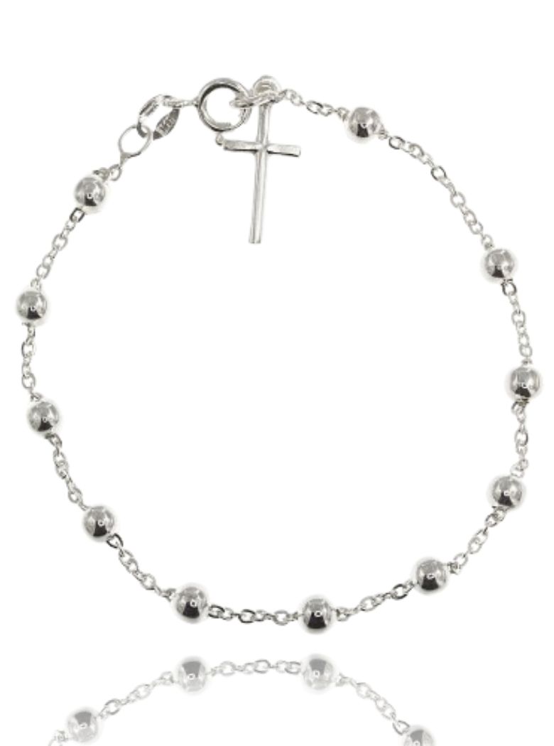 Pulsera tipo rosario fabricada en plata 925 de 19cm de largo con bolitas de 4mm y cruz colgante.