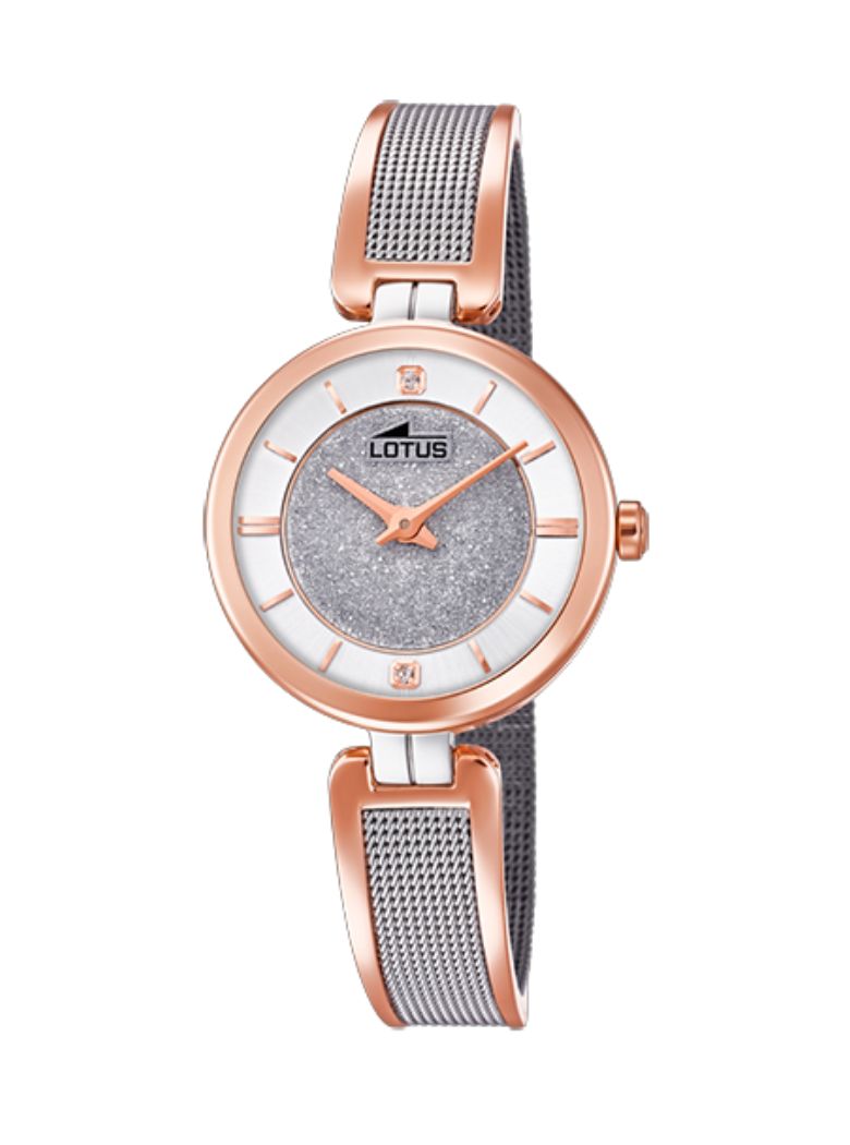 Reloj Lotus con correa semirrígida de acero, índices 6 y 12 de circonitas, combinado en rose en caja, correa y dígitos.