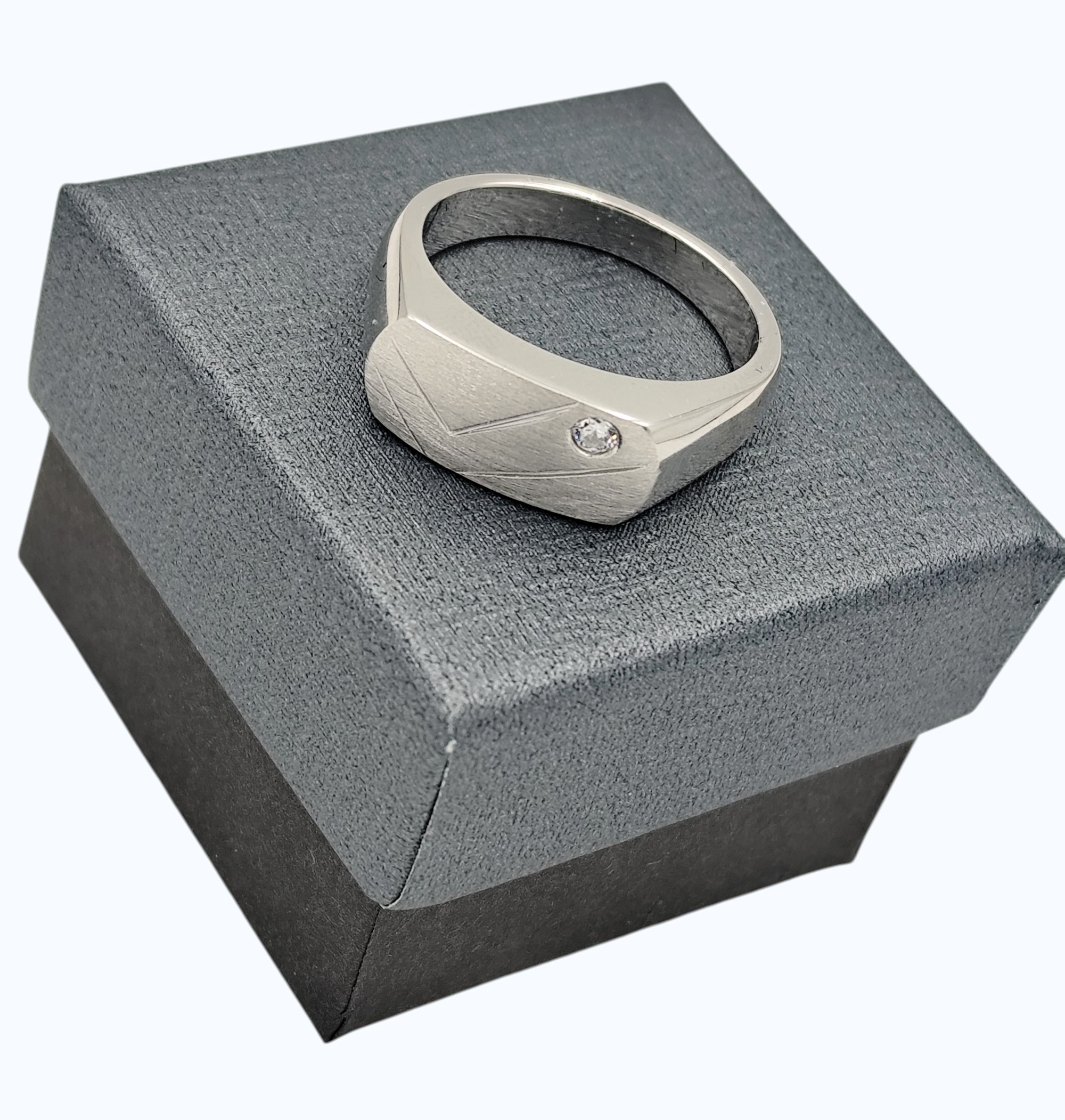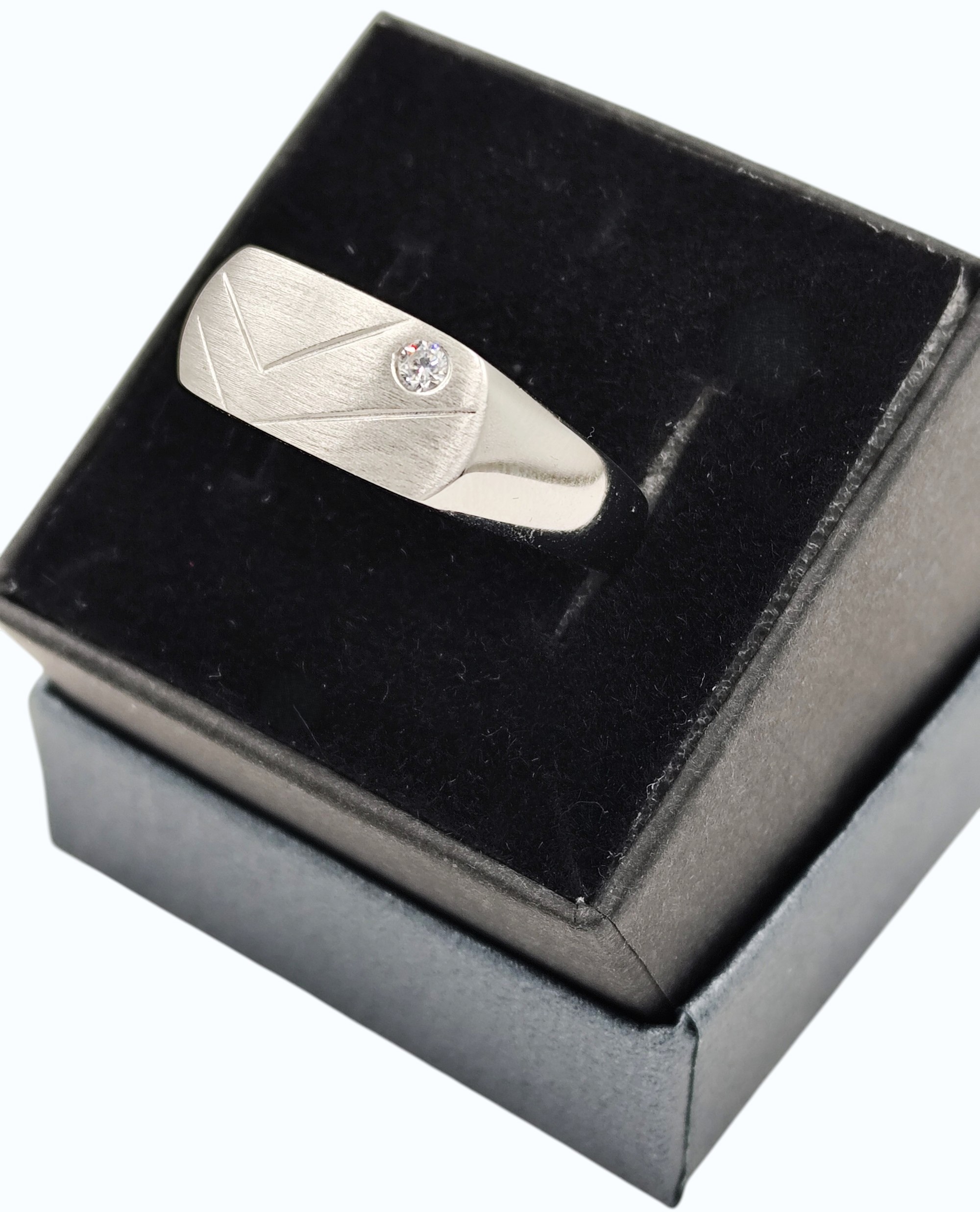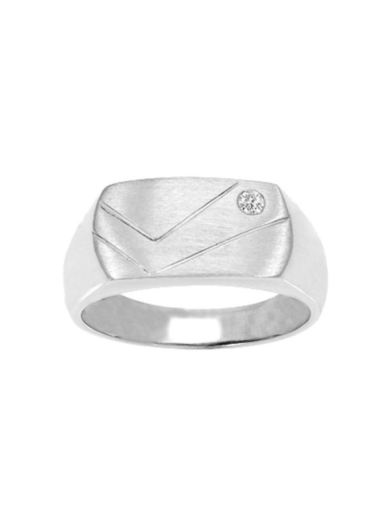Anillo tipo sello fabricado en plata de ley 925 decorado con circonita blanca en una esquina y líneas grabadas en la superficie frontal acabada en mate.